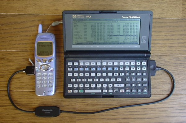用意する物、PanasonicのPHS KH-PX35S (2001年3月11日現在関東では新規購入者なら1円で購入可能) かKX-HS100 (九州松下電器feelH"1号機) と、PalmVxとWorkPad C3 (8602-40J・8602-50J) と繋ぐと専用データー通信ケーブル Panasonic KH-HA10、ヒロセのコネクターか、HP100/200LX専用のシリアルケーブルHP F1015A、と必要に応じて半田小手や工具。
