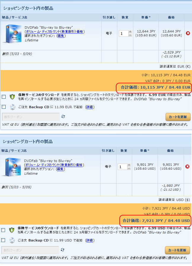 DVDFabはユーロ価格も同じ金額となっているので、為替の関係で$で購入した方が良い。